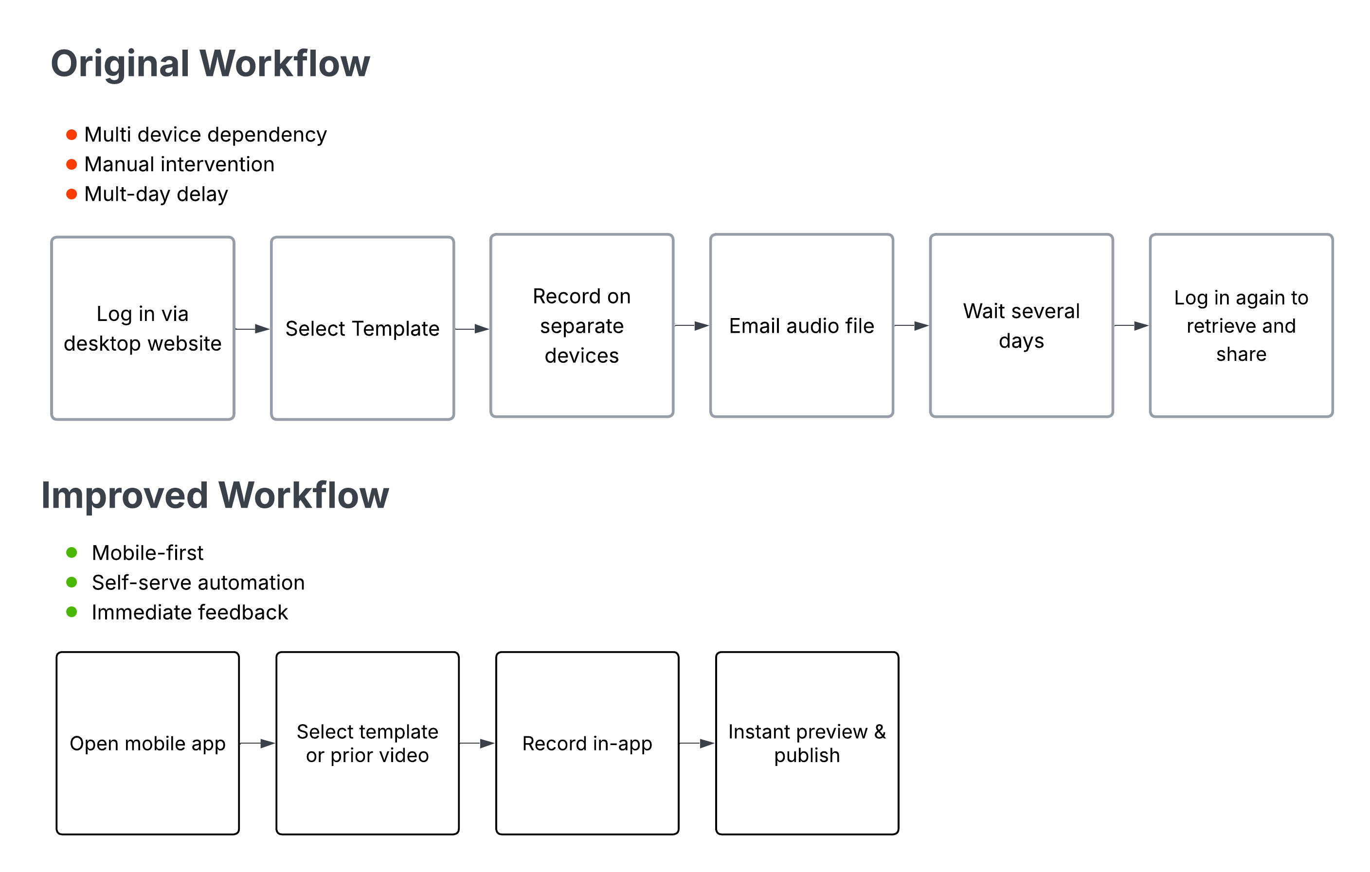 The workflow was slow and fragmented, requiring agents to move between devices and rely on manual handoffs. Producing a finished video often meant recording across platforms, transferring assets via email, and waiting days for processing before distribution.